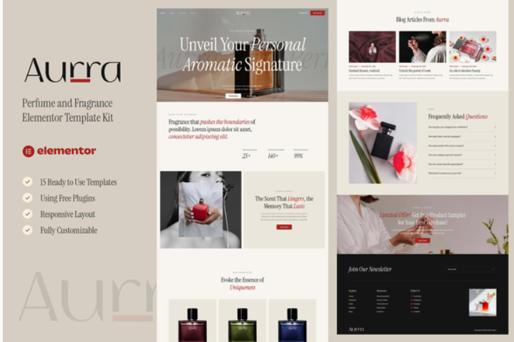 Aurra – Perfume and Fragrance Elementor Template Kit (NOT A WordPress Theme) is created especially for websites to showcase Perfume, Cologne, Fragrance, and other cosmetics products. Aurra has a simple, modern and clean design with 100% responsive layout, and very easy to customize and can be used by anyone without having to understand coding. This template kit includes stunning carefully crafted 11 Pages and 15 Stunning Templates, you can build your professional-looking website just a click away.