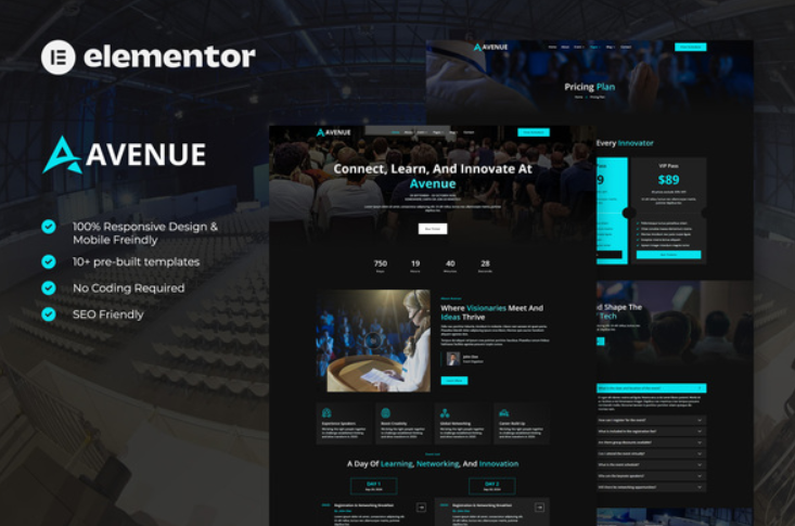 Avenue is modern and elegant elementor template kit for Event & Conference. You can also use this creative template kit for conferences, congresses, seminars, webinars, meetings, concerts, invitations and more. You can effortlessly infuse your event’s distinctive personality.
