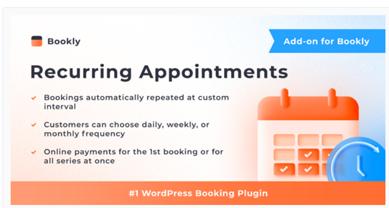The Bookly Recurring Appointments Add-on is a powerful extension designed for businesses that offer ongoing or repeatable services. With this add-on, your clients can easily schedule recurring appointments according to their preferred frequency, whether daily, weekly, or monthly. This streamlines the booking process, reduces administrative tasks, and improves customer satisfaction by providing flexibility and convenience.