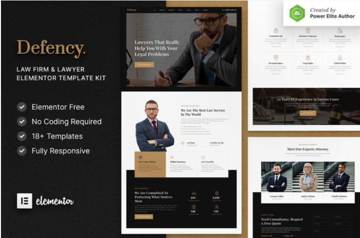 Defency is a modern and elegant Elementor Template Kit for those who want to create a professional-looking WordPress-based website for Law Firms, Legal Attorneys, Lawyers, and any kind of legal practice. This kit has been optimized for use with the free Hello Elementor theme but may be used with most themes that support Elementor. 100% responsive layout and retina-ready!