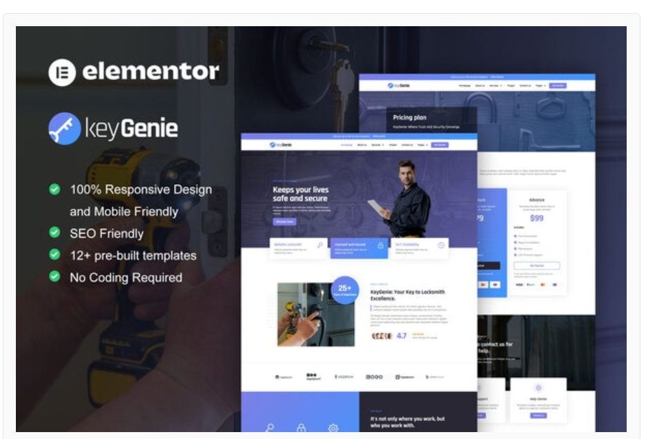 KeyGenie is Elementor Template Kit for Locksmith & Key Maker Service. This template kit will help you to create any website related to locksmith and key maker service such as key maker, smart lock, door repair, home security service, etc. It has 12+ pre-built templates with clean design and modern style.