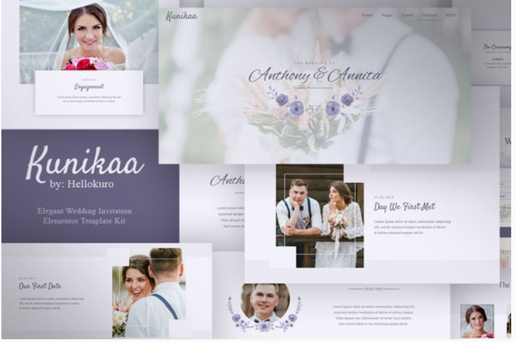 Create your beautiful wedding events and save your precious time with best elementor template kit. Kunikaa is an elegant, clean and simple wedding invitation template with fully responsive design and easy to customize. This template contain 10 pages layout for your wedding website and ready-to-use pages feature couple’s profile, events, invitation, contact form, RSVP form, beautiful gallery, and countdown clock counter time.