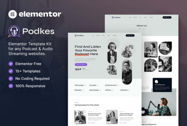 Podkes is a modern Elementor Template Kit to create a pro-level and functional website for any Audio Podcast, Podcasting Network, Audio Streaming, Radio Station, Internet Radio, or any related business.